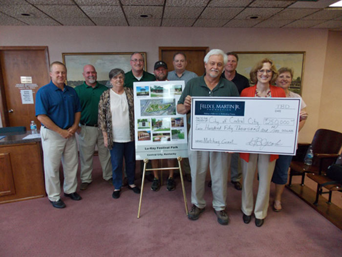 Kathy Jacobi, president of the Felix E. Martin Jr. Foundation, was on hand to present the city with a check for $250,000 to go toward the construction of the Lu-Ray Park in downtown Central City.